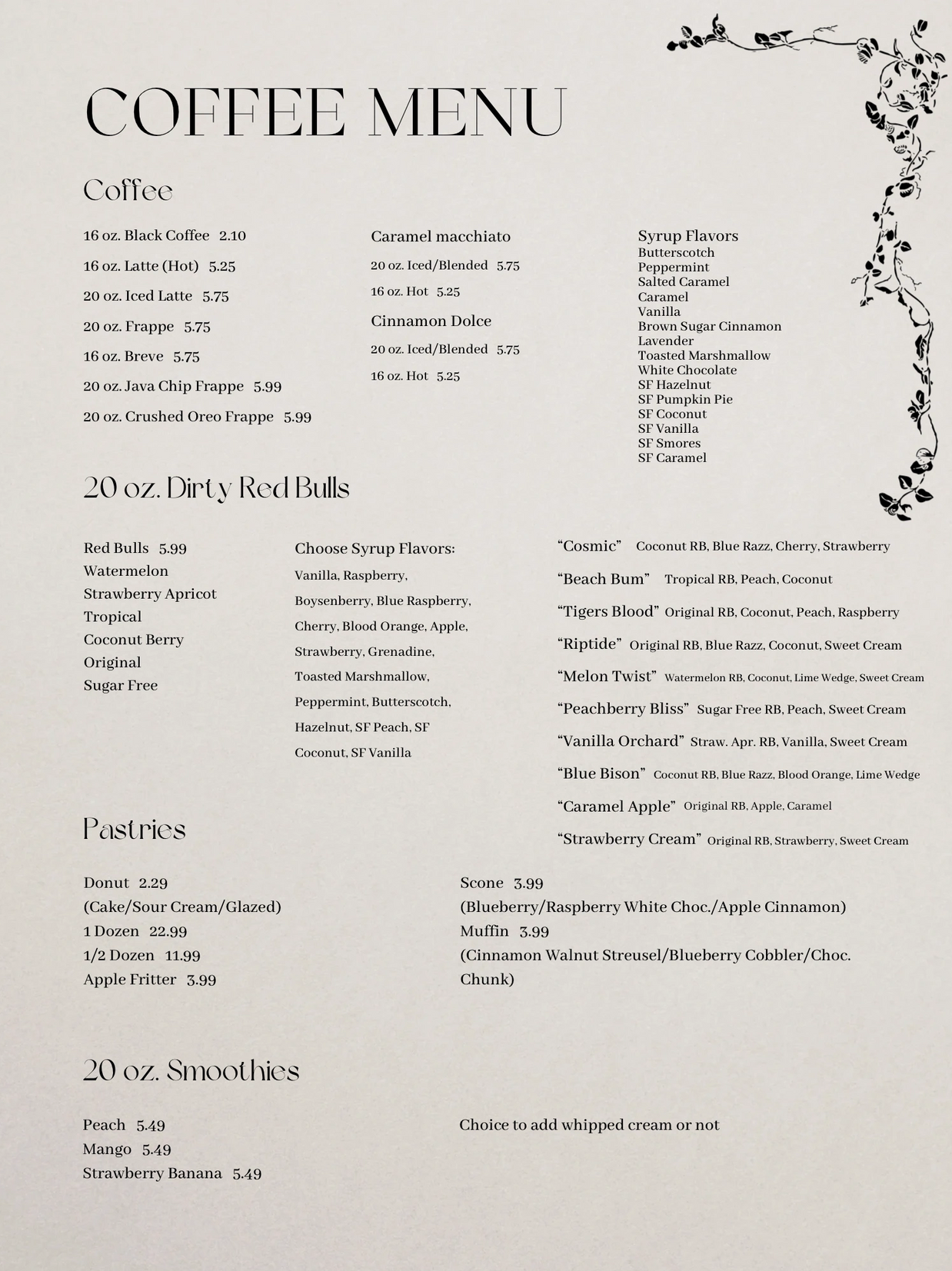 Come enjoy our Gourmet Coffees, Dirty Red Bulls, and Smoothies made with top quality ingredients and handcrafted exactly how you like it, so every drink feels like a treat just for you! Stop by to see our everchanging menu and monthly specials!